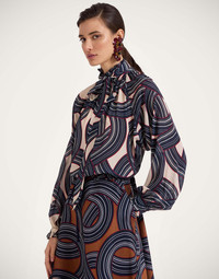 There’s nothing like a little romance to zhuzh up your wardrobe separates. Light, beautiful and unapologetically feminine, the Cerere Blouse enraptures in this glorious Montecarlo print. Its vintage-inspired shape appeals to our whimsy side and is finished with a detachable foulard at the collar that can be tied, styled as a belt or let loose. Crafted from spring in our chic crepe marocaine for an upscale finish that works its wonder with jeans at the weekend too. Details & Fit - Crepe marocaine - Detachable neck sash secured with loops - V neck - Puff sleeves - 100% Made in Italy - Composition: 100% viscose - The model is 180 cm / 5′ 11″ tall and wears a size S