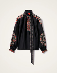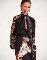 There’s nothing like a little romance to zhuzh up your wardrobe separates. Light, beautiful and unapologetically feminine, the Cerere Blouse is one for your admirers to fall in love with. Its vintage-inspired shape appeals to our whimsy side and is finished with a detachable foulard at the collar that can be tied, styled as a belt or let loose. Crafted in fluttery crepe de chine silk and arriving in our vintage inspired Fans print, hand-placed for a luxury effect. Details & Fit - Hand-placed print - Detachable neck sash secured with loops - V neck - Puff sleeves - 100% Made in Italy - Composition: 100% Cotton - The model is 180 cm tall and wears a size S - Garment length: 62cm