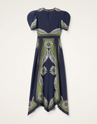 One of J.J.’s favourites of this season, the Cherie Scarf Dress is pure feminine fantasy. We have a passion for scarf dressing this season, and this is one of our fancier, form-fitting party pieces - slim in the top with a voluminous sleeve and a skirt that flows from the fitted waist like water, this beauty comes with a hand-placed print in 100% Italian silk. Not crazy about that thigh high slit? Close it for a more demure design, darling. Details & Fit - Silk dress - Short, voluminous sleeve - Fitted body - Slits up flow skirt - 100% Made in Italy - Composition: 100% silk - The model is 177 cm / 5′ 9.7″ tall and wears a size S