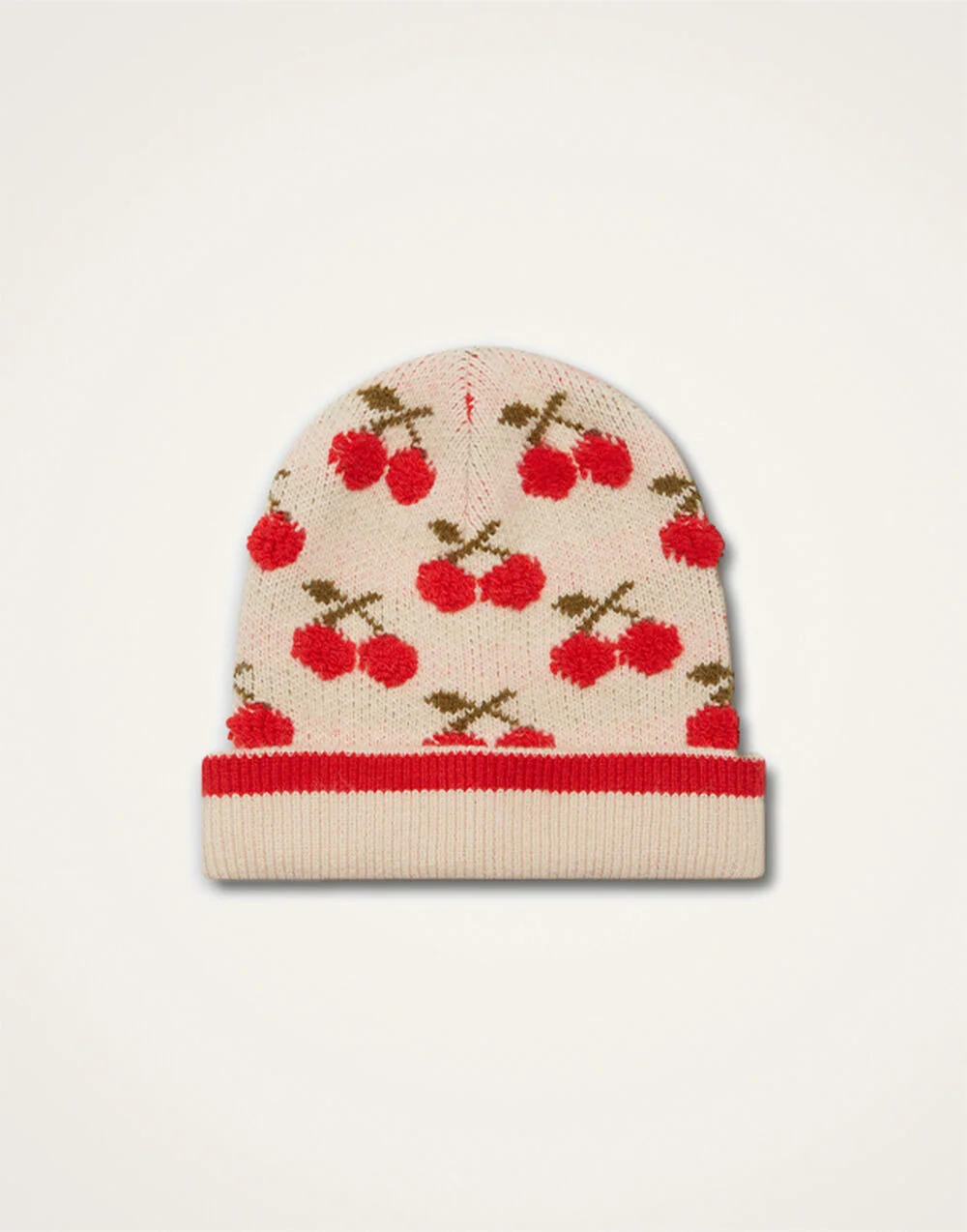 Keep that beautiful head cozy and cute this season, ragazze, in our deliciously juicy Cherry intarsia beanie. Crafted from the warmest Italian Alpaca wool blend, it’s the perfect accessory to add a little kick to your winter uniform. Pair it with the matching Scarf and Gilet for a full, fruit and fashion-forward look, or alone as the cherry on top of any winter outfit. Details & Fit - Alpaca blend beanie - Cherry intarsia embroidery on ivory base - Composition: 46%Acrilic 34%Alpaca 14%Polyammide 6%Polyester