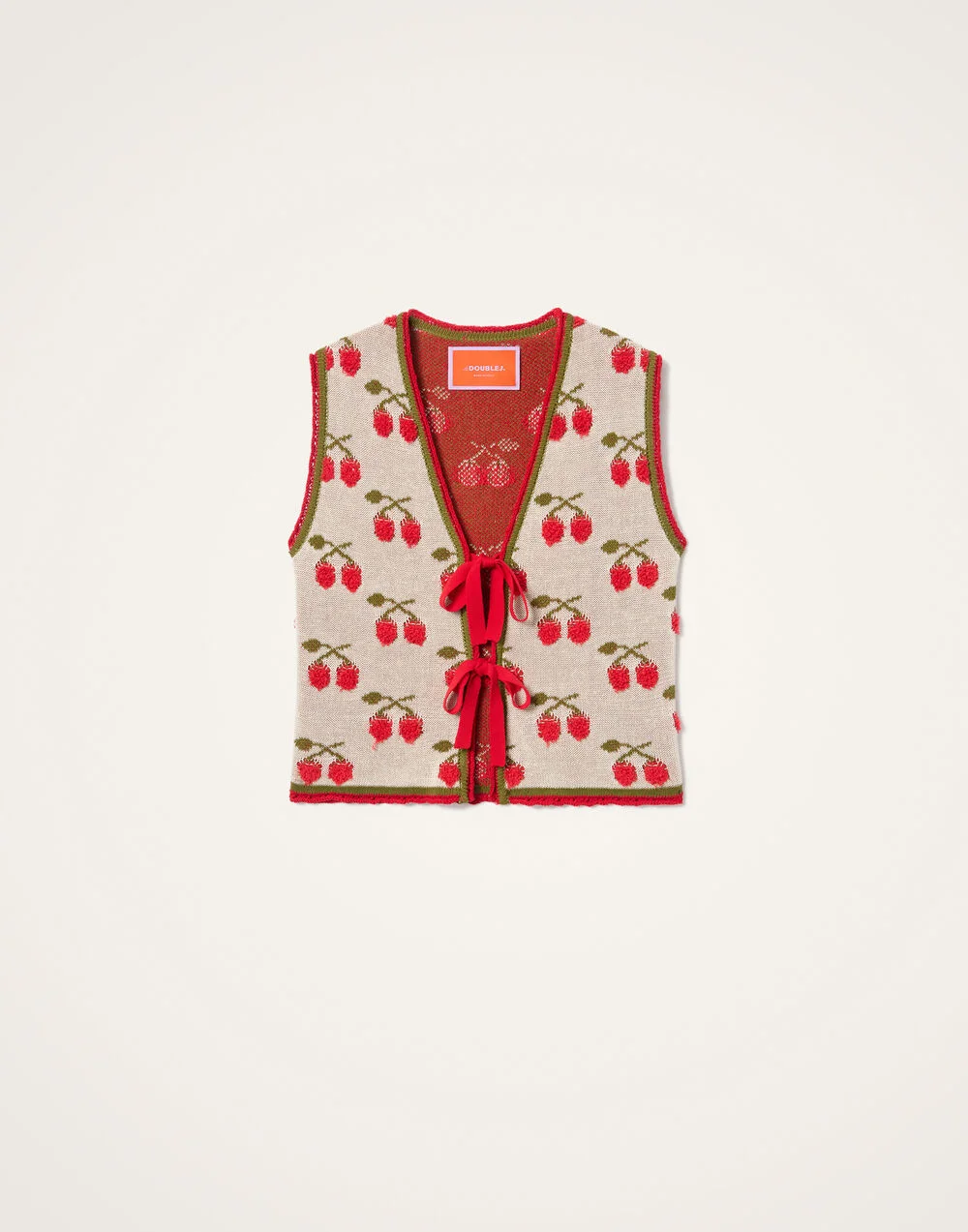 Indulge your playful side with the Cherry Gilet, a delicious new addition to our bestselling family of Cherry knits and homeware. This open vest is quite literally dripping with charm, thanks to its vibrant knit jacquard featuring a tactile 3D cherry motif rendered in a whimsical fur stitch. Designed to tie gracefully at the front, it's the perfect high-vibe layer to add a pop of unexpected sweetness and Italian flair to any look, from crisp white shirts to flowing maxi dresses. Details & Fit - Garment fit: regular - Cotton blend - Knit Jacquard with cherries motif in fur stitch - Open vest that ties at front - 91% Cotton 9% Nylon - Unlined - Made in Italy - The model is 180 cm / 5′ 11″ tall and wears a size S