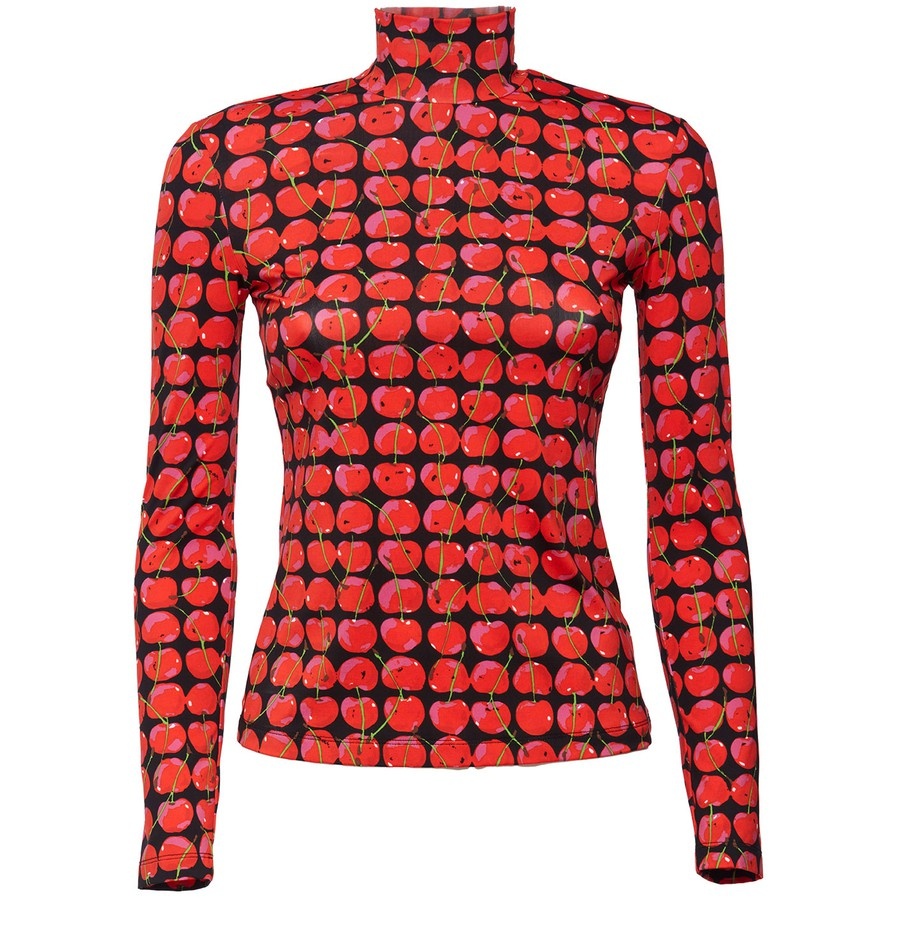 DESCRIPTION - Long-sleeved sweater - Slim fit - Mockneck - Two-tone print - Floral pattern / flower pattern DETAILS AND CARE MATERIAL: 83% Polyamide / 17% Elastan COLOR: black_cherries COUNTRY OF MANUFACTURE: Italy PRODUCT CODE: LDJQGU78MU34TAAA03