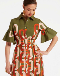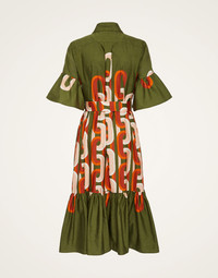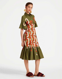 One of our all-time best-selling styles, the Choux, arrives this season in a midi version. Same tiered sleeves and flirty hem, same crisp Italian cotton, but now with more maximalist length for those transitioning from Summer to Fall. And in this exquisitely hand-placed print, this dress is as delicious as the pastries she named for. Details & Fit - Cotton poplin - Collar - Fluted short sleeves - Dropped waist - Tiered skirt - Hand placed print - Buttons through front - 100% Made in Italy - Composition: 100% Cotton - The model is 180 cm tall and wears a size S - Garment length: 90cm
