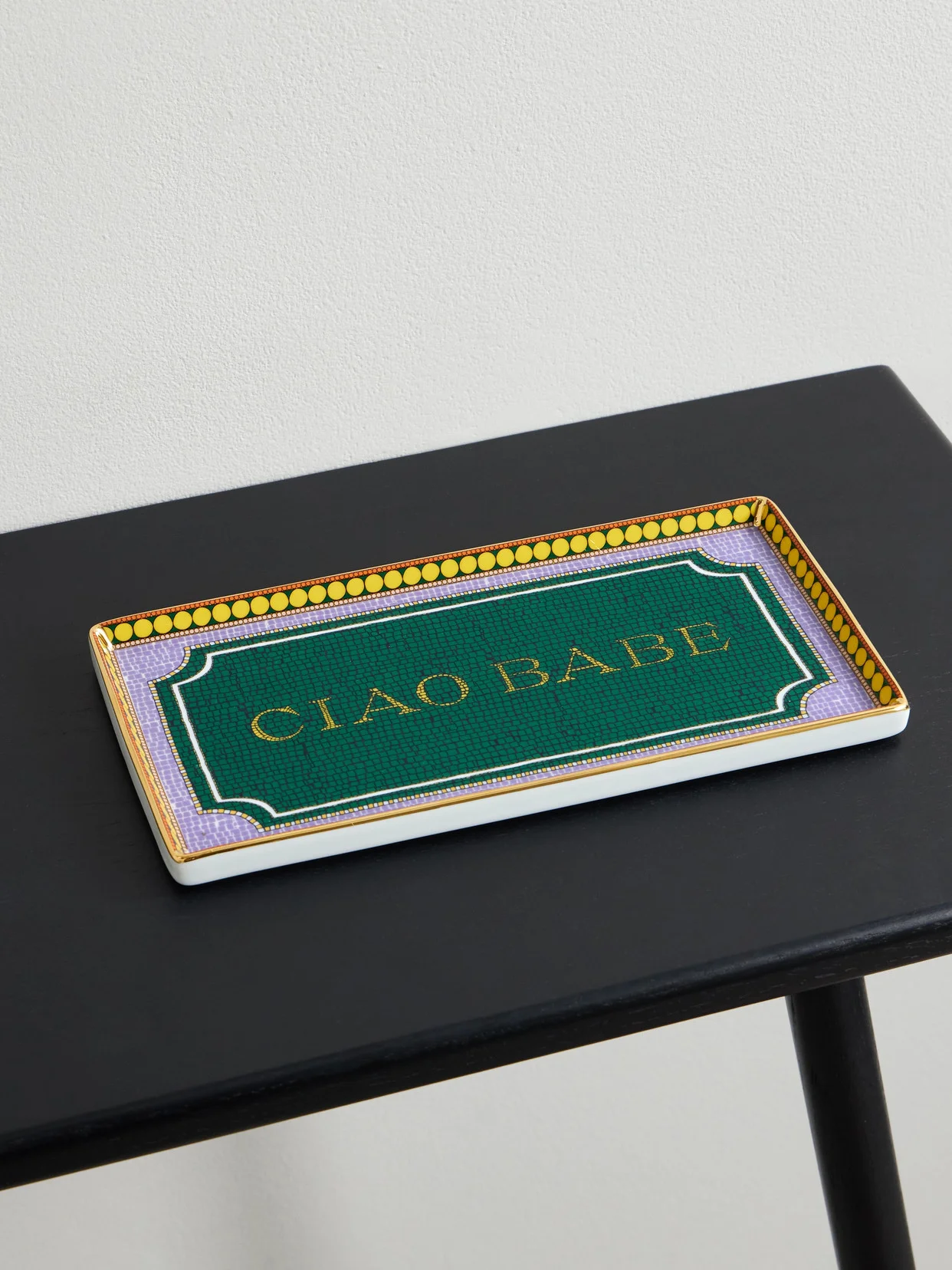 La DoubleJ's tray has endless possibilities, whether you use it as a trinket tray or for serving petit-fours. It's made from porcelain with a gleaming gold-plated rim and printed with a mosaic-like pattern reading the phrase 'Ciao Babe'.