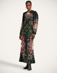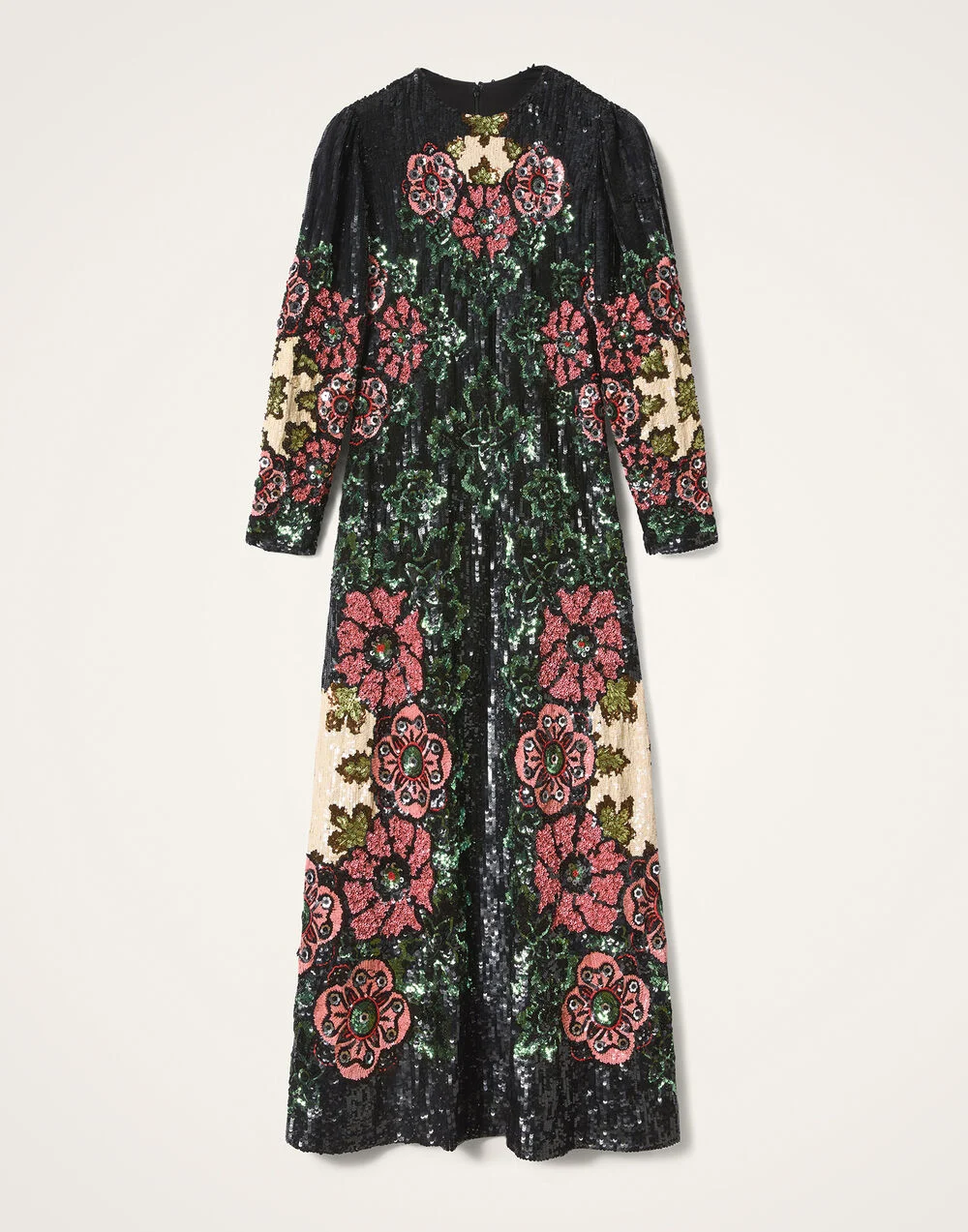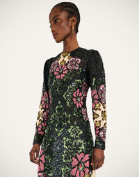 It’s the Long Sleeve Swing Dress you know and love, now in a more sensual, figure-hugging fit. With a curve-celebrating body that flares out at the hips into an ankle-grazing skirt, we crafted this beauty in party-ready embroidered paillettes strewn with our swirling Bounty print for all the extra fabulousness. That’s what you wanted, right? Details & Fit - Embroidered paillettes - Long sleeves - Form fitting through hips - No pockets - Composition: 50% Polyester 25% PVC Beads 25% Glass Beads - 100% Made in Italy - The model is 178 cm / 5′ 10″ tall and wears a size S