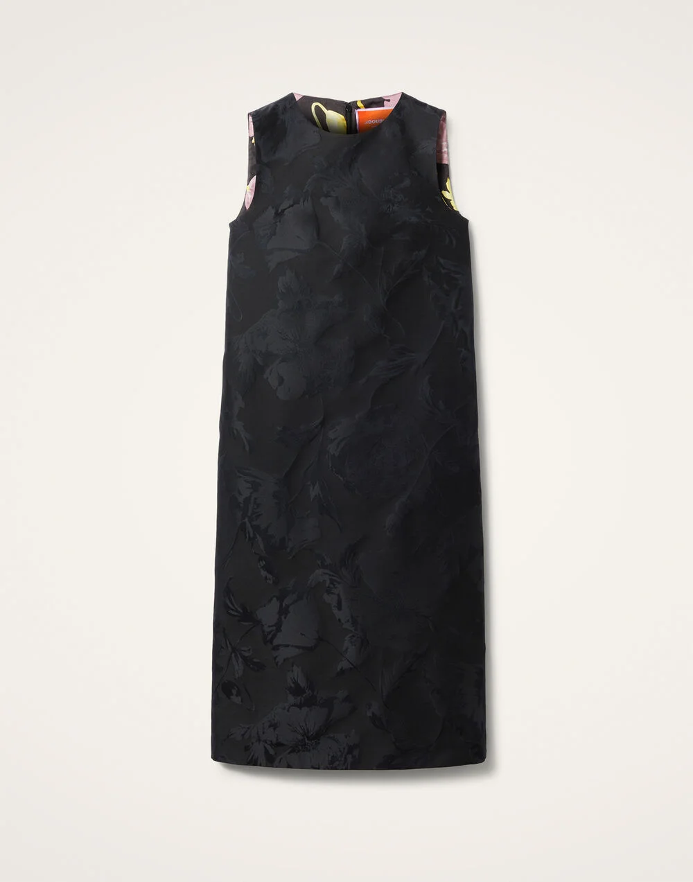 Need a boost? Skip the ginger shot and head straight for this stunner. All about giving you a kick in the happy pants, the Column Dress is a total delight for the senses crafted in textured jacquard. Its straight column shape doesn’t cling and is friendly on all figures, while a slit in the skirt (at the back) means it’s still good for shimmying. A year-round stunner in this Sylph print! Details & Fit - Jacquard - Round neck - Sleeveless - Column shape - Maxi length - Slit at back - 100% Made in Italy - Composition: 39% Polyester 37% Recycled Polyester 24% Viscose - The model is 180 cm / 5′ 11″ tall and wears a size S - Garment length: 120cm