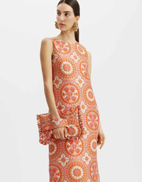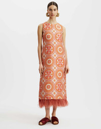 Need a boost? Skip the ginger shot and head straight for this stunner. All about giving you a kick in the happy pants, the Column Dress is a total delight for the senses crafted in textured jacquard and finished with a fabulous contrast feather trim. Its straight column shape doesn’t cling and is friendly on all figures, while a slit in the floor-length skirt (at the back) means it’s still good for shimmying. A summer belter in this Sun print! Details & Fit - Jacquard - Round neck - Sleeveless - Column shape - Maxi length - Slit at back - 100% Made in Italy - Composition: 72% Polyester 21% Cotton 4% Silk 3% Polyamide - The model is 179 cm tall and wears a size S - Garment length: 115cm