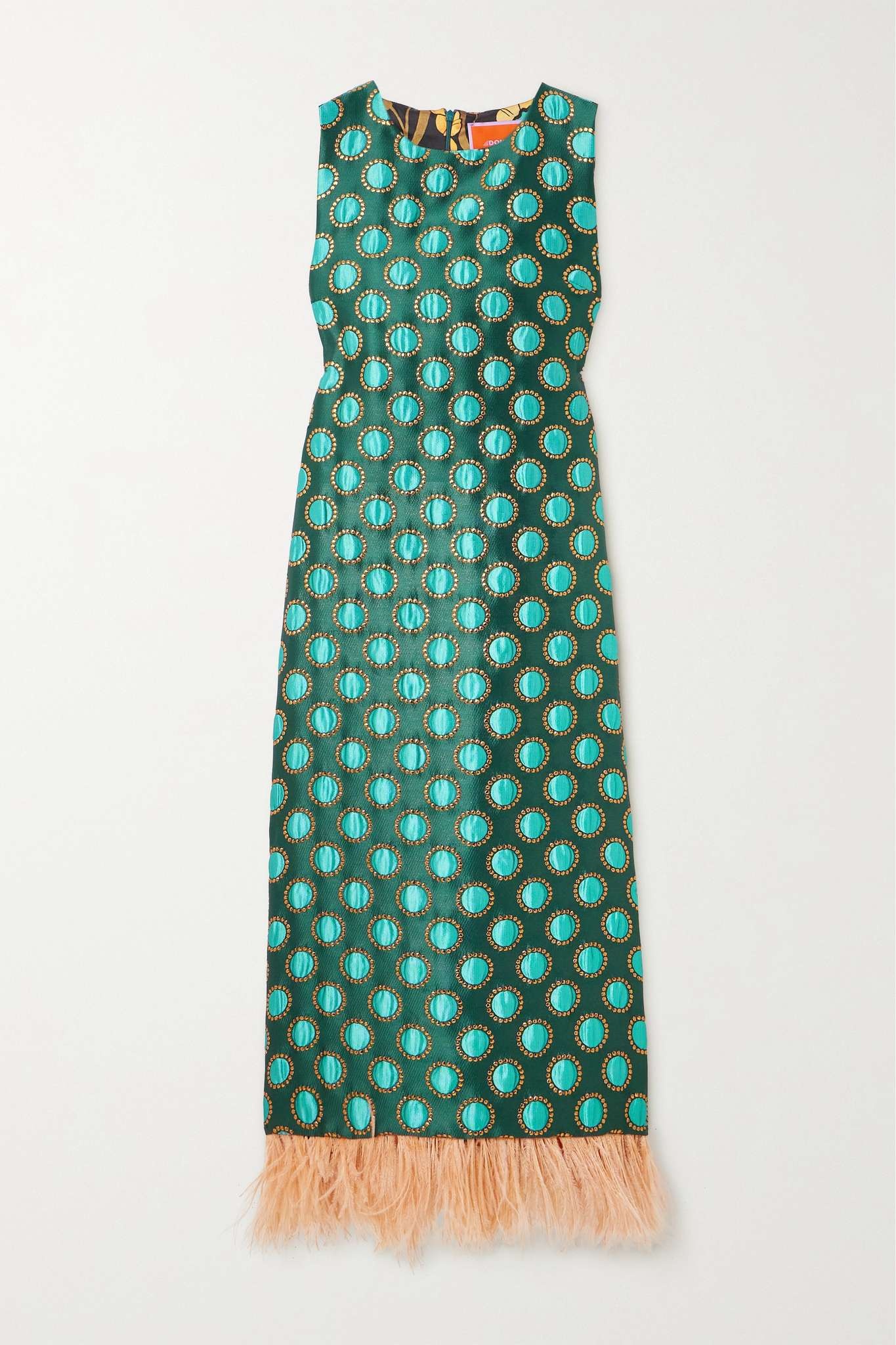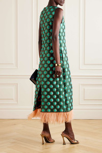 EDITORS'NOTES La DoubleJ's dress is made from shimmering metallic jacquard that's woven with the label's new 'Winter Sun Emerald' pattern and has a chic column silhouette. The midi hem is traced with feathers that shimmy as you move around the room - enhance the effect with heels. SIZE & FIT - Fits true to size, take your normal size - Designed for a slightly loose fit - Mid-weight, non-stretchy fabric with feather trim - Model is 177cm/ 5'10" and is wearing a size Small DETAILS & CARE - Petrol, turquoise and gold jacquard, pastel-orange feathers - Concealed zip fastening along back - 78% polyester, 9% metallic fibers, 7% silk, 4% polyamide, 2% feathers (Ostrich) - Dry clean - Designer color: Winter Sun Emerald - Ostrich: South Africa