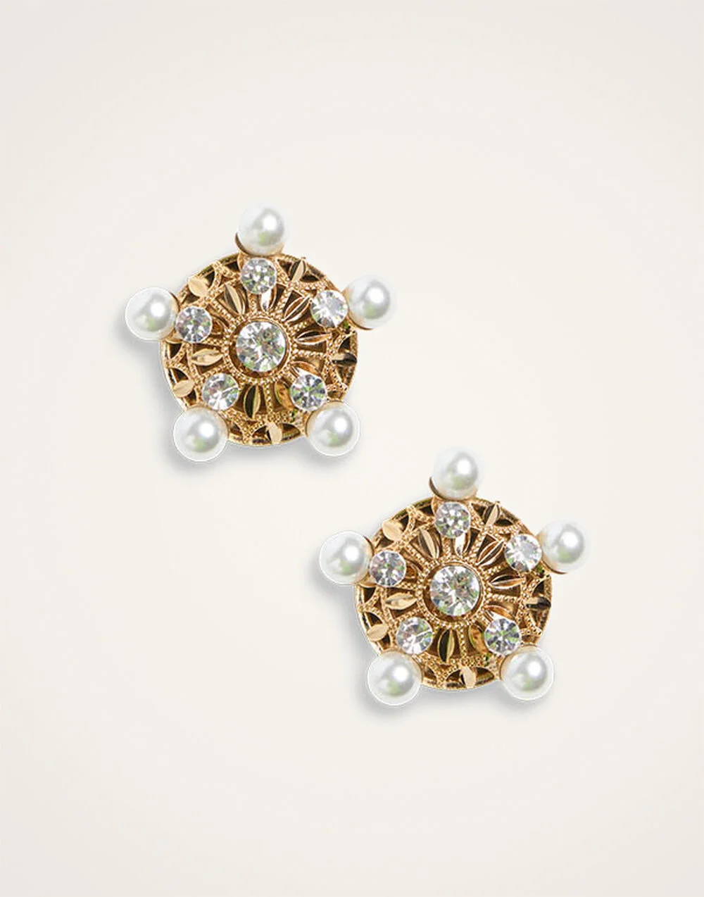 Inspired by the Palazzo Corsini in Florence, these majestic earrings are maybe the most luxurious lobe adornments in our accesories arsenal. Crafted from brass embellished with pearls, these add seriously regal romance to any date night dress, like the Super Swing or Vaudeville in Italian lace. Details & Fit - Star shape Earrings - Clip-on Closure - Brass with pearls - Made in Italy