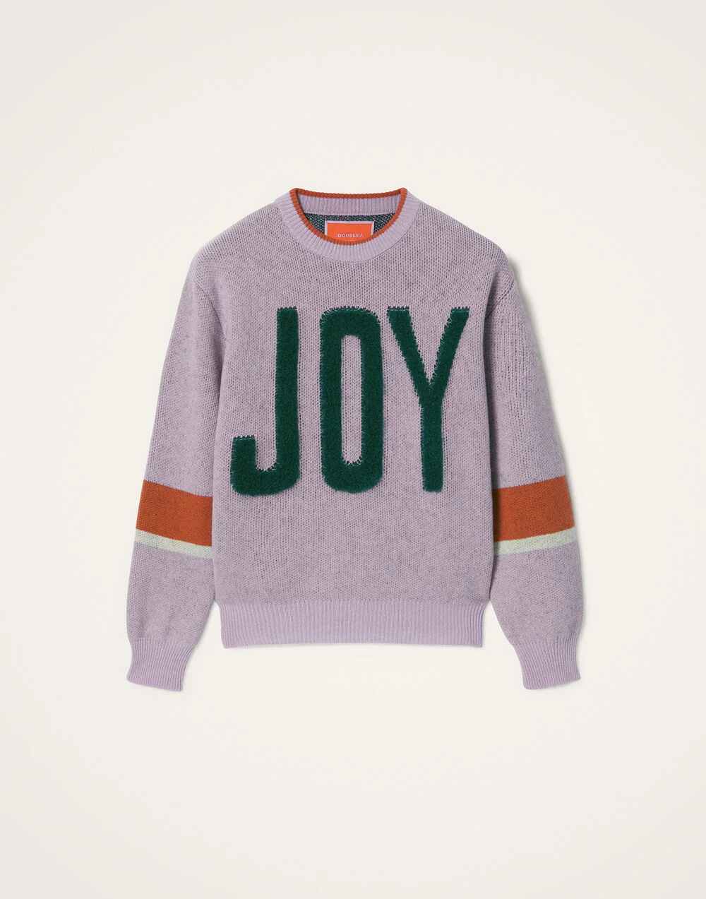 Oversized and snuggly as all get-out, this solid jumper arrives with our vibration-raising message of "JOY" woven across it using an intricate Intarsia technique. With a contrast color collar and stripes on the sleeves, it's got a vintage varsity vibe with our signature modern twist. Oh yeah, and it's cashmere.... Details & Fit - Oversized solid jumper - Intarsia writing across chest - Contrast color collar - contrast stripes on sleeves - Made in Italy - Composition: 65% Wool 18% Mohair 11% polyamide 6% Cashmere - The model is 180 cm / 5′ 11″ tall and wears a size S