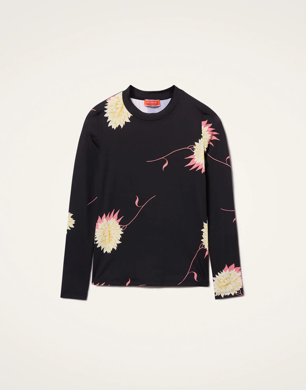 Who said wardrobe basics have to be basic? This fitted crewneck is destined to become a backbone of your wardrobe with none of the bore and only fun in this Derby print. With a slim silhouette that hits long on the body, it is crafted in our figure-skimming jersey which is light and warm. Wear solo or layer it under one of our printed dresses for a cute pattern clash. Details & Fit - Jersey - Slim-fit - Crewneck - Long sleeves - 100% Made in Italy - Composition: 83% Polyamide 17 % Elastane - The model is 178 cm / 5′ 10″ tall and wears a size S