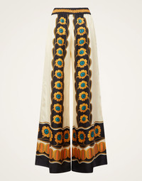 We cannot take credit for inventing the Palazzo Pant silhouette, but we will take credit for making them cool again. These trousers sit on the waist and fall flared, with a wide, breezy fit through the legs – like a skirt, but with the comfort of pants. Cut in our fluid silk twill from Lake Como, they arrive chic and versatile in this hand-placed Daisychain motif that can be dressed down (with a knit) or up (with the matching Foulard Shirt) with ease. Details & Fit - Silk twill - Hand-placed print - Elastic waist - Placed print - Concealed side pockets - Roomy fit - 100% Made in Italy - Composition: 100% Silk - The model is 179 cm tall and wears a size S - Garment length: 106cm