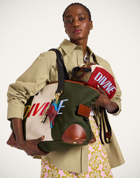 No-one does bags better than the Italians and this oversized canvas carry all comes crafted by the finest artisans in the country. With buttery leather details across the ample base and handles, this beauty arrives with one of our DoubleJ mantras writ large across it in exquisite embroidery. It's perfect for any weekend getaway or for elevating a beach day look - consider us tote-ally obsessed. Details & Fit - Canvas and leather tote - "Divine" embroidered slogan - Leather base and handle details - 100% Made in Italy - Measures 34cm tall, 45cm wide, 21cm deep - Composition: 85% Cotton 15% Cow Leather