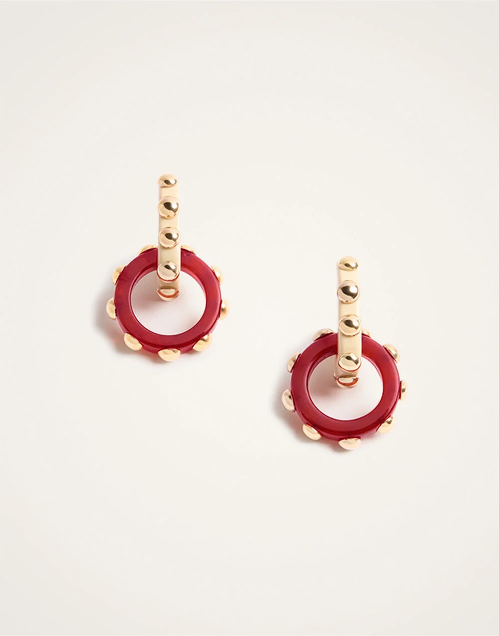 Double up your earring drama with these interlocking hoop earrings, crafted from solid resin with brass studs. A little romantic, a little rock'n'roll, and a whole lot of fun. Details & Fit - Double hoop earrings - Contrast colored resin - Gold studs along hoop exterior - Brass lever back - Butterfly Closure - Composition: 85% Resin 15% Metal - Made in Italy