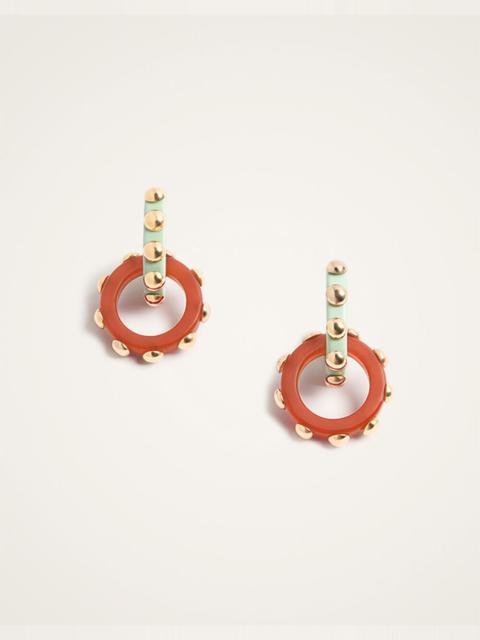 Double up your earring drama with these interlocking hoop earrings, crafted from solid resin with brass studs. A little romantic, a little rock'n'roll, and a whole lot of fun. Details & Fit - Double hoop earrings - Contrast colored resin - Gold studs along hoop exterior - Brass lever back - Butterfly Closure - Composition: 85% Resin 15% Metal - Made in Italy