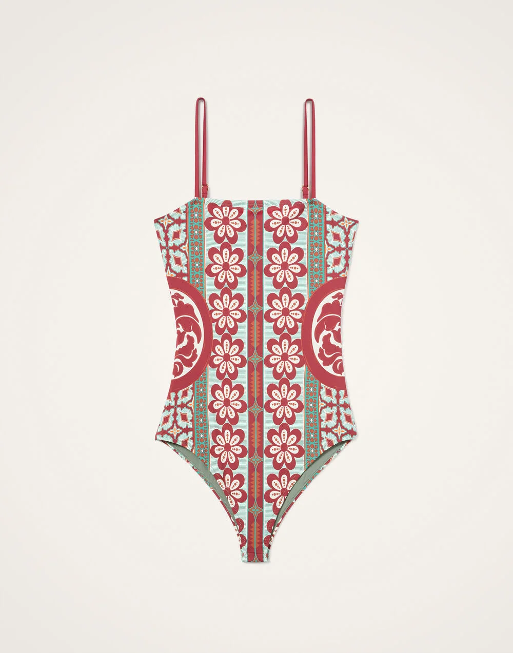 When you’re holidaying in paradise, shouldn’t your swimsuit be paradise too? Elle is designed for va-va-voom vacations with an elegant square neckline, slim spaghetti straps and a flattering construction that pulls you in at the waist. New for your next escape in this ultra-sophisticated hand-placed Pagoda print, the only thing that would make it better is if it reversed to give you a second swimsuit in one. Oh wait… Details & Fit - Italian supreme Lycra - Square neckline - Spaghetti straps - 100% Made in Italy - Composition: 74% Polyamide 26% Elastane - The model is 178 cm / 5′ 10″ tall and wears a size S