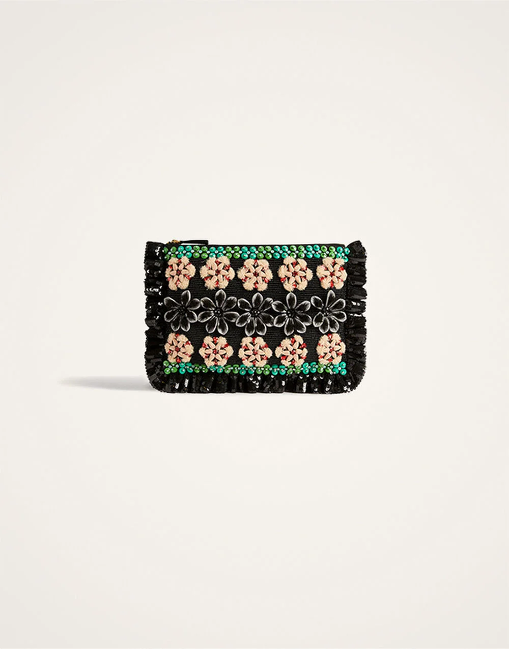 Our soft oversized zip pouch is a multi-use beauty that not only elevates the status of your dinner-to-dancing outfit, but will easily house a cell phone, mini tablet and cardholder. The side handle makes it super simple to carry around which – great news! – gives you free hands to hold your bellini at a cocktail party. A stunning canvas for our swirling embroidery. Eclectic opulence = our summer vibe. Details & Fit - Side handle - Zipper - Measurement: 32cm x 23cm - 100% Made in India - Composition: 70% Viscose 9% Glass 8% Plastic 3% Metal 10% Silk