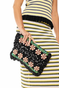 DETAILS AND INSIGHT La Doublej embroidered hand pochette in bloomy. 70% Viscose 9% Plastic 8% Glass 7% Metal 4% Acrylic 2% Cotton Dry Clean Made In India Style BAG0081_EMB108MXF02_BL01