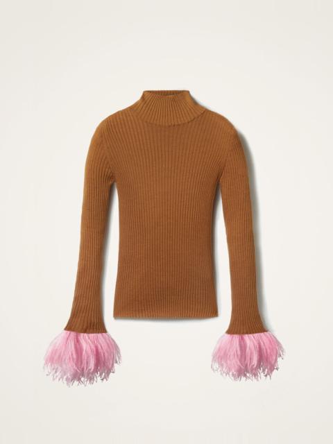 In true Italian style, we like to add a little extra joy jolt to all the clothes we create - here, we’ve taken a classic solid turtleneck shape and woven it in a sumptuous silk-cashmere blend, before trimming each cuff with a plume of feathers. Slim through the chest and shoulders and wide along the base to create an hourglass shape, this is a super flattering wardrobe staple, fabulous alone but extra elegant under a 24/7 Jacket with just the feathers peeking through. Consider it a happy high-kick to the heart. Details & Fit - Silk-cashmere blend - High neck - Slim through shoulders - Wide at hem - Feathers around entire cuff - Ribbed body - 100% Made in Italy - Composition: 70%Cashmere 30%Silk - The model is 181 cm tall and wears a size S - Garment length: 60cm