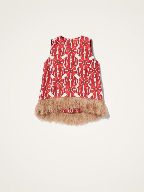 As far as interesting silhouettes go, this top may win the gold star. The asymmetrical hem, trapeze silhouette and marabou feather trim creates an alluring form. In our summer ready rustic cotton, it’s undoubtedly upscale but looks equally as great with some jeans and flats. Details & Fit - Rustic cotton - Unlined - Sleeveless top - Ostrich feathers on bottom hem - Made in Italy - Composition: 93% Cotton 2% Elastane 5% Ostrich Feathers - The model is 178 cm / 5′ 10″ tall and wears a size S