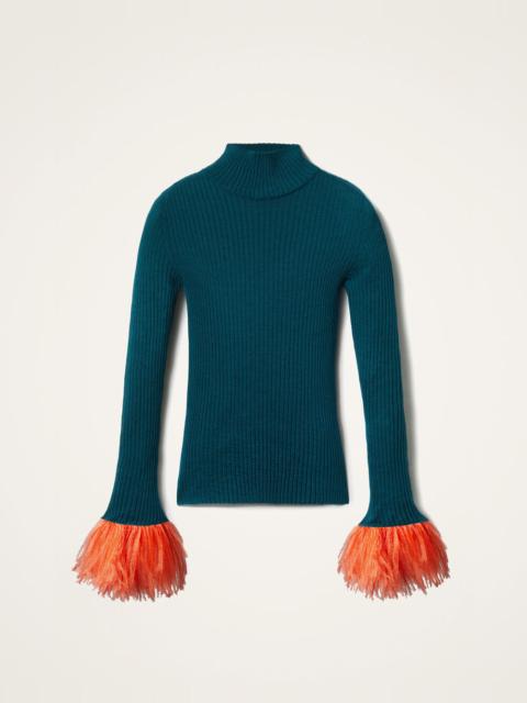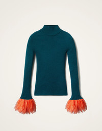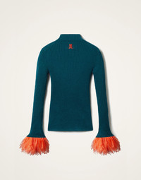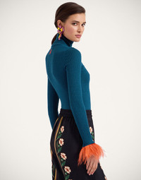 In true Italian style, we like to add a little extra joy jolt to all the clothes we create - here, we’ve taken a classic solid turtleneck shape and woven it in a sumptuous silk-cashmere blend, before trimming each cuff with a plume of feathers. Slim through the chest and shoulders and wide along the base to create an hourglass shape, this is a super flattering wardrobe staple, fabulous alone but extra elegant under a 24/7 Jacket with just the feathers peeking through. Consider it a happy high-kick to the heart. Details & Fit - Silk-cashmere blend - High neck - Slim through shoulders - Wide at hem - Feathers around entire cuff - Ribbed body - 100% Made in Italy - Composition: 70%Cashmere 30%Silk - The model is 181 cm tall and wears a size S - Garment length: 60cm
