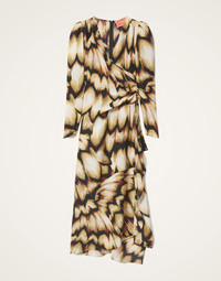 A celebration of the feminine shape, this dress arrives inspired by the flattering effect of a classic wrap dress with a little added modern sensuality with an asymmetrical panel in the front the opens into a slit on the side. An exaggerated shoulder flows into a long dart sleeve that finishes in a tight glove cuff making for a bold and beautiful silhouette as at home at date night as it is at a wedding. Details & Fit - Silk dress - Dart sleeve - Puff shoulder - Beast cut - Slit up leg - 100% made in Italy - Composition: 100% silk - Garment length 135cm - The model is 178 cm / 5′ 10″ tall and wears a size S