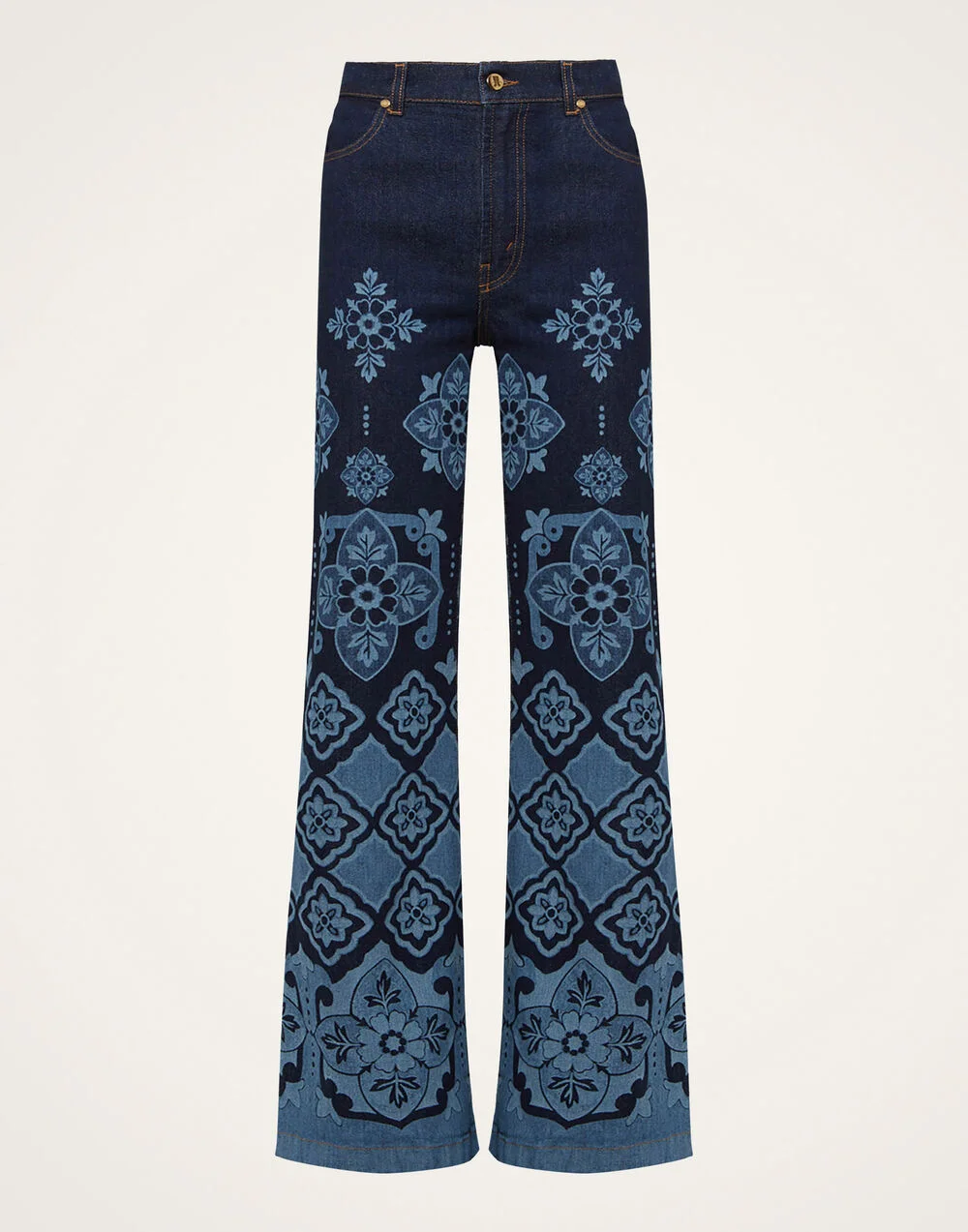 La DoubleJ does denim! Designed for those looking to elevate this everyday essential, these are not your average flares. With a super high waist that hugs your curves in all the right places, these are a modern take on a retro classic, arriving in our exquisite hand-placed, laser-printed Corte print which keep this dark denim from feeling anything but basic. Falling straight to the knee before opening up into a wide, romantic bell-bottom, these beauties have a little stretch built in, so you can channel your inner Studio64 without diminishing their booty-boosting shape. We’re partial to pairing it with our Sisterhood Bomber, but think these are print perfect with our Boy Shirt or any classic tee already in your closet. To help you seize the day the Italian way, you'll receive a free, special Carpe Denim Weekly Joy Journal so that you can plot out your daily pick-me-ups in high-vibe style. For more tips on what to wear with your fabulous new pair of jeans, check out our guide on How to Style Your Denim here . Details & Fit - High waist - Button fly and zip closure - Stretch denim - Wide flare - Laser printed - Pockets in front with fifth internal piccolo pocket - Embroidered back pockets - 100% Made in Italy - Composition: 100% Cotton - The model is 179 cm tall and wears a size 26 - Garment length: 112cm