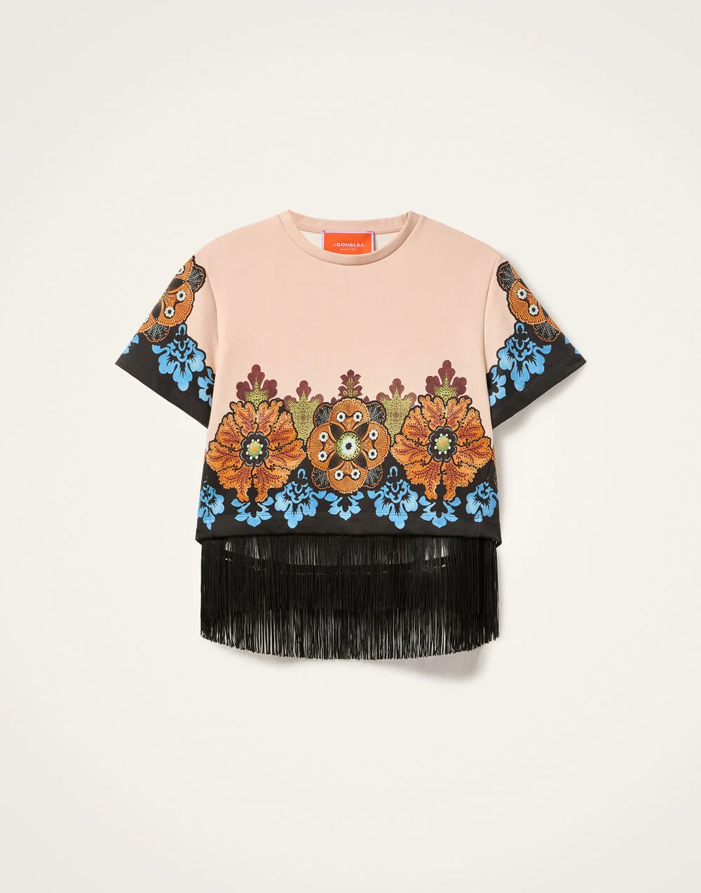 Pssh, forget the humble T-shirt. This bodacious beauty promises to raise the temperature of any pair of pants in your wardrobe with its texture-fest fringing and hand-placed blooms. We’ve crafted it in our heavy cotton jersey which feels structured and smooth and cut it in a boxy shape that is a smidge oversized to exude where-did-you-get-that cool for all ages, shapes and sizes. Super special styled with our sumptuous jacquard pants for date nights or dancing; so fun over a pair of jeans. Details & Fit - Heavy cotton jersey - Placed print - Round neck - Cropped silhouette - Fringe trim - 100% Made in Italy - Composition: 100% Cotton - The model is 176 cm / 5′ 9″ tall and wears a size S