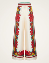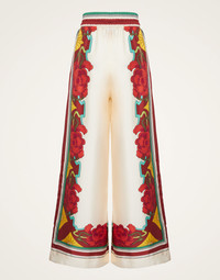 We cannot take credit for inventing the Palazzo Pant silhouette, but we will take credit for making them cool again. These trousers sit on the waist and fall flared, with a wide, breezy fit through the legs – like a skirt, but with the comfort of pants. They're made in our fluid silk twill from Lake Como and arrive in this molto elegante print inspired by Milan’s Liberty era and exquisitely hand-placed by our kick-ass Italian artisans. Details & Fit - Silk twill - Elastic waist - Placed print - Concealed side pockets - Roomy fit - 100% Made in Italy - Composition: 100% Silk - The model is 180 cm tall and wears a size S - Garment length: 106cm