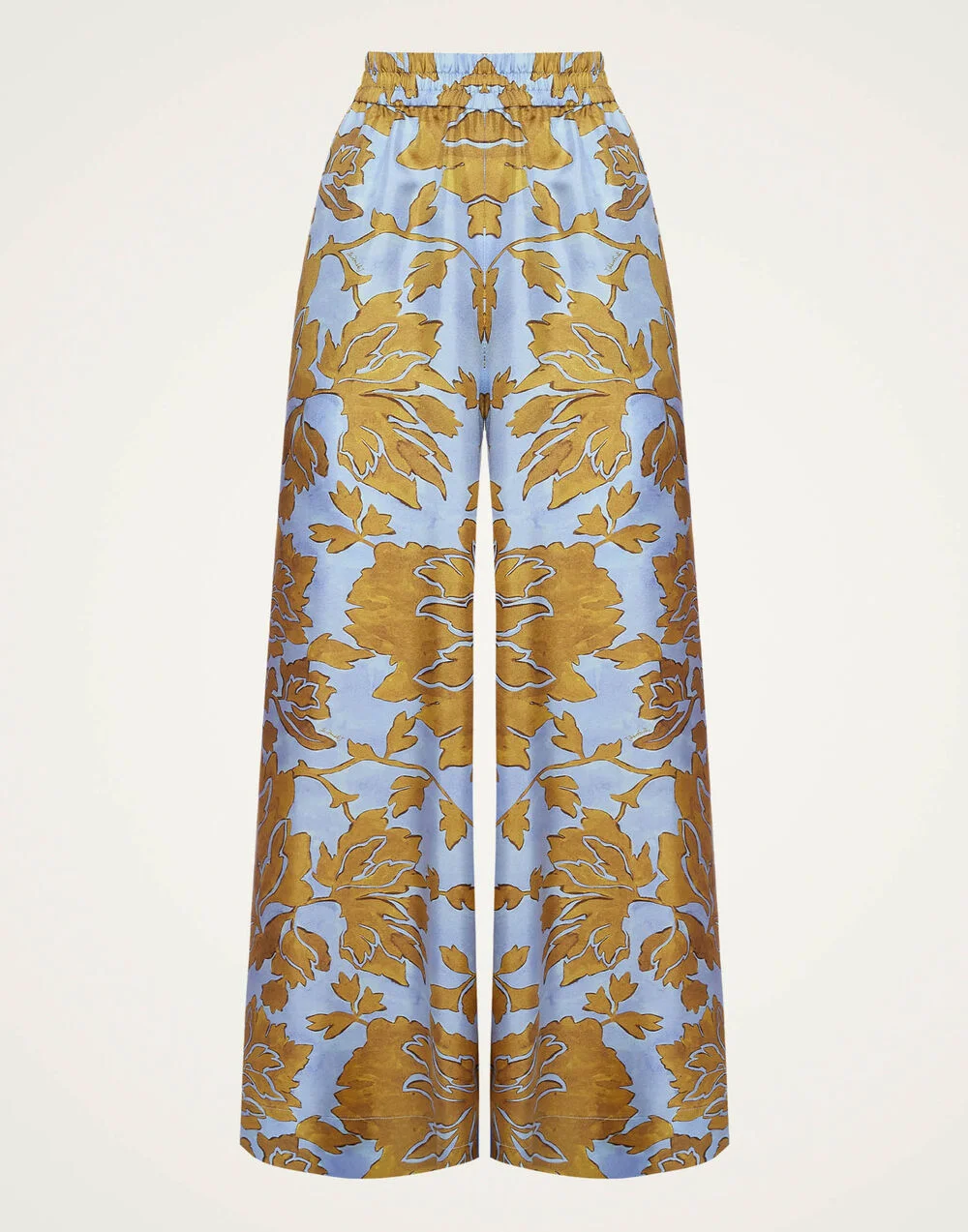 We cannot take credit for inventing the Palazzo Pant silhouette, but we will take credit for making them cool again. These trousers sit on the waist and fall flared, with a wide, breezy fit through the legs – like a skirt, but with the comfort of pants. A bellissima wardrobe addition in this chic and timeless Fan print. Details & Fit - Silk twill - Elastic waist - Concealed side pockets - Roomy fit - 100% Made in Italy - Composition: 100% Silk - The model is 177 cm tall and wears a size S - Garment length: 110cm