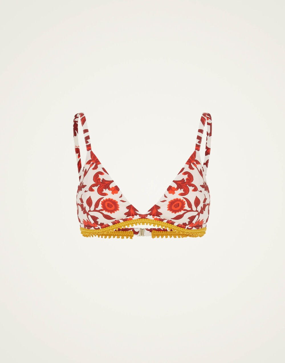 A reimagining of the classic triangle bikini top, this high-vibe version comes crafted in collaboration with British vacationwear experts Orlebar Brown in the bold botanical Dragonflower print, a symbiosis of strength and beauty. With its adjustable shoulder straps and embroidered band along the bottom, this top is the perfect blend of form and function (and is a touch more revealing than our other two-pieces for some appropriately Italian va va voom). Details & Fit - Lycra swim top - Triangle cups fixed on band - Clip in back - Adjustable straps - Embroidered band - Composition: 80% Poliammide 20% Elastane - The model is 180 cm tall and wears a size S