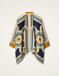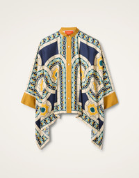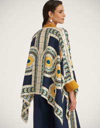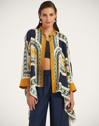 A J.J. staple year-round, our gorgeous silk Foulard Shirt is like a walking fine art piece. Part shirt, part poncho, it’s crafted in fluid Italian-made silk in a chic waterfall style fit that is flattering on all shapes and sizes. Draping off the arms with a Korean collar and buttons down the front, it’s a beautiful canvas for our hand-placed prints, including this ultra-chic, Deco-inspired print. Style with black pants for the boardroom, unbutton over a swimsuit for the beach bar. Details & Fit - Silk twill - Hand-placed print - Korean collar - Buttons through front - Waterfall style fit - Cuffs - 100% Made in Italy - Composition: 100% Silk - The model is 179 cm tall and wears a size S - Garment length: 65cm