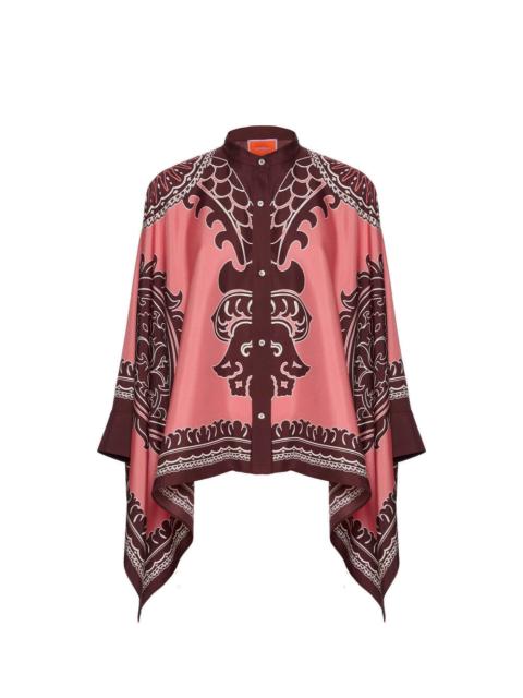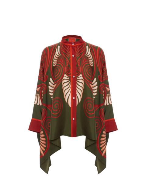 A J.J. staple year-round, our gorgeous silk Foulard Shirt is like a walking fine art piece. Part shirt, part poncho, it’s crafted in fluid Italian-made silk in a chic waterfall style fit that is flattering on all shapes and sizes. Draping off the arms with a Korean collar and buttons down the front, it’s a beautiful canvas for our hand-placed prints. Style with black pants for the boardroom; unbutton over a swimsuit for the beach bar. Details & Fit - Oversized Fit - Silk twill - Placed print - Korean collar - Buttons through front - Waterfall style fit - Cuffs - Composition: 100% Silk - Made in Italy
