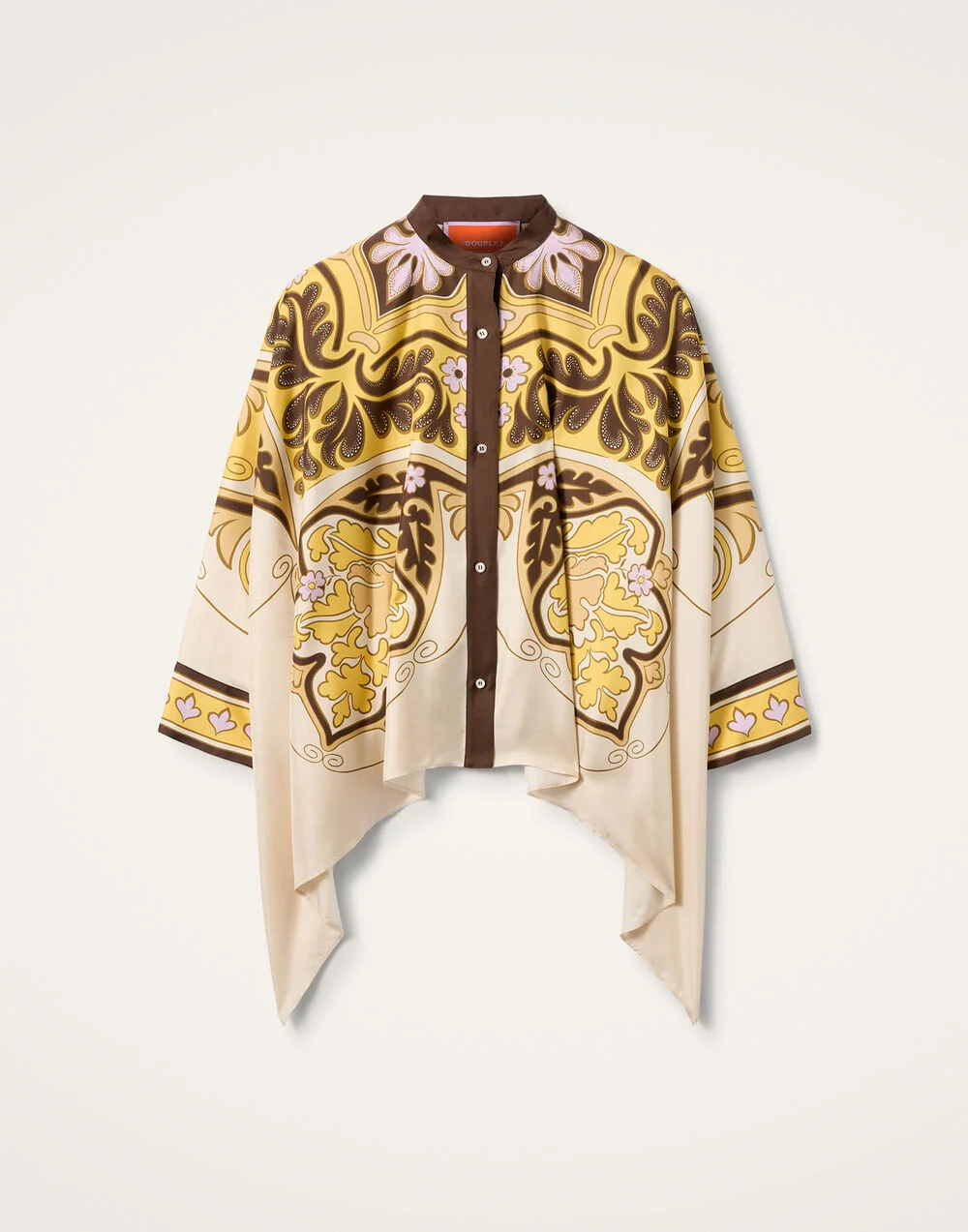 A J.J. staple year-round, our gorgeous silk Foulard Shirt is like a walking fine art piece. Part shirt, part poncho, it’s crafted in fluid Italian-made silk in a chic waterfall style fit that is flattering on all shapes and sizes. Draping off the arms with a Korean collar and buttons down the front, it’s a beautiful canvas for our hand-placed prints, including this ultra-chic, Renaissance-inspired print. Style with black pants for the boardroom, unbutton over a swimsuit for the beach bar. Details & Fit - Silk twill - Hand-placed print - Korean collar - Buttons through front - Waterfall style fit - Cuffs - 100% Made in Italy - Composition: 100% Silk - The model is 180 cm / 5′ 11″ tall and wears a size S