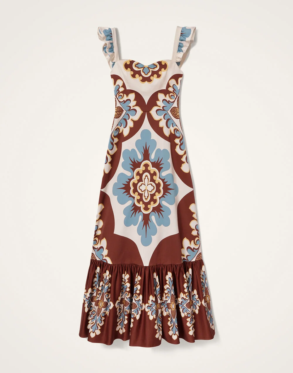 A maxi dress with maximalist impact, the Gingerbread dress was designed to go from pasticcini in the piazza to spritzes by the seaside. Cut from smooth Italian cotton with a hint of stretch, she has a cinched waist that flares out into a fluid skirt with a romantic tier. Equal parts laid-back ease and Lake Como luxury in one perfect day to night dress. It arrives in our hand-placed Palazzo print in delectable shades of chocolate and blue. Seriously, what could be sweeter? Details & Fit - Long cotton dress - Ruch sleeves - Cross back - Tiered skirt - Garment length: 110cm - 100% Made in Italy - Composition: 97% Cotton 3% Elastane - The model is 178 cm / 5′ 10″ tall and wears a size S