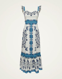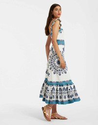A midi dress with maximalist impact, the Gingerbread Dress was designed to go from pasticcini in the piazza to spritzes by the seaside. Cut from breezy Italian cotton, she has a cinched waist that flares out into fluid skirt with a romantic tier. Ruched straps cross over the back but its perfectly bra friendly. Equal parts laid-back ease and Lake Como luxury in one perfect day to night dress. Details & Fit - Midi cotton dress - Ruch sleeves - Cross back - Tiered skirt - Made in Italy - Composition: 97% Cotton 3% Elastane - The model is 179 cm tall and wears a size S - Garment length: 112cm