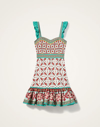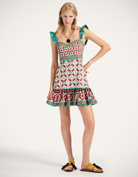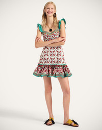 Just like her beloved big sister, the Gingerbread Dress, this beauty was built for warm-weather celebrations. Same romantic ruche above the knee and along the straps that criss-cross across the back, same form-flattering silhouette, just shorter and with our latest season’s prints perfectly placed across it. Details & Fit - Mini cotton dress - Ruched straps - Cross back - Tiered skirt - Made in Italy - Composition: 97% Cotton 3% Elastane - The model is 178 cm / 5′ 10″ tall and wears a size S