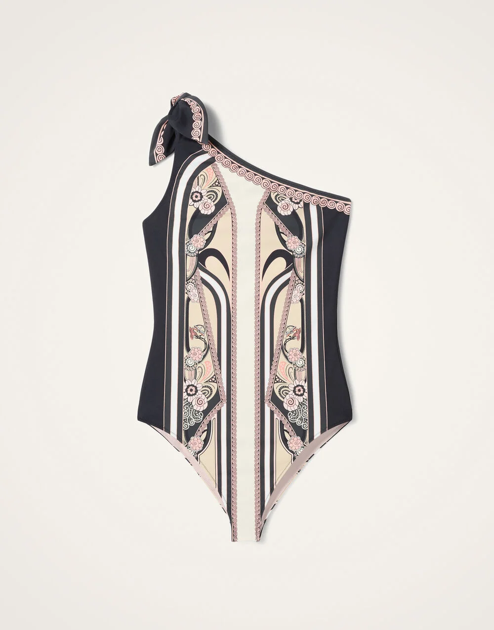 We call this the one-shouldered wonder. This asymmetrical one-piece bather features a single adjustable strap that lets you tie the bow up as tight or as loose as you please, plus another little bow just for show at the hip. Sexy but not skimpy (personally how we like our beachwear), it arrives in our hand-placed Ambrosia print for molto elegante seaside frollicking. Details & Fit - Garment fit: fitted - Supreme lycra - Placed print - Single adjustable bow strap - 74% Polyamide 26% Elastane - Fully lined - Made in Italy - The model is 178 cm / 5′ 10″ tall and wears a size S
