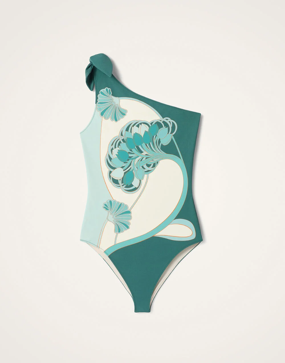 We call this the one-shouldered wonder. This asymmetrical one-piece bather features a single adjustable strap that lets you tie the bow up as tight or as loose as you please, plus another little bow just for show at the hip. Cut in our luxe supreme Italian Lycra, it’s sexy but not skimpy (personally how we like our beachwear), as perfect for the pool at Il Pellicano as it is under a pair of linen shorts for perusing a Caravaggio in Rome. Details & Fit - Garment fit: fitted - Supreme lycra - Placed print - Single adjustable bow strap - 74% Polyamide 26% Elastane - Fully lined - Made in Italy - The model is 177 cm / 5′ 9.7″ tall and wears a size S