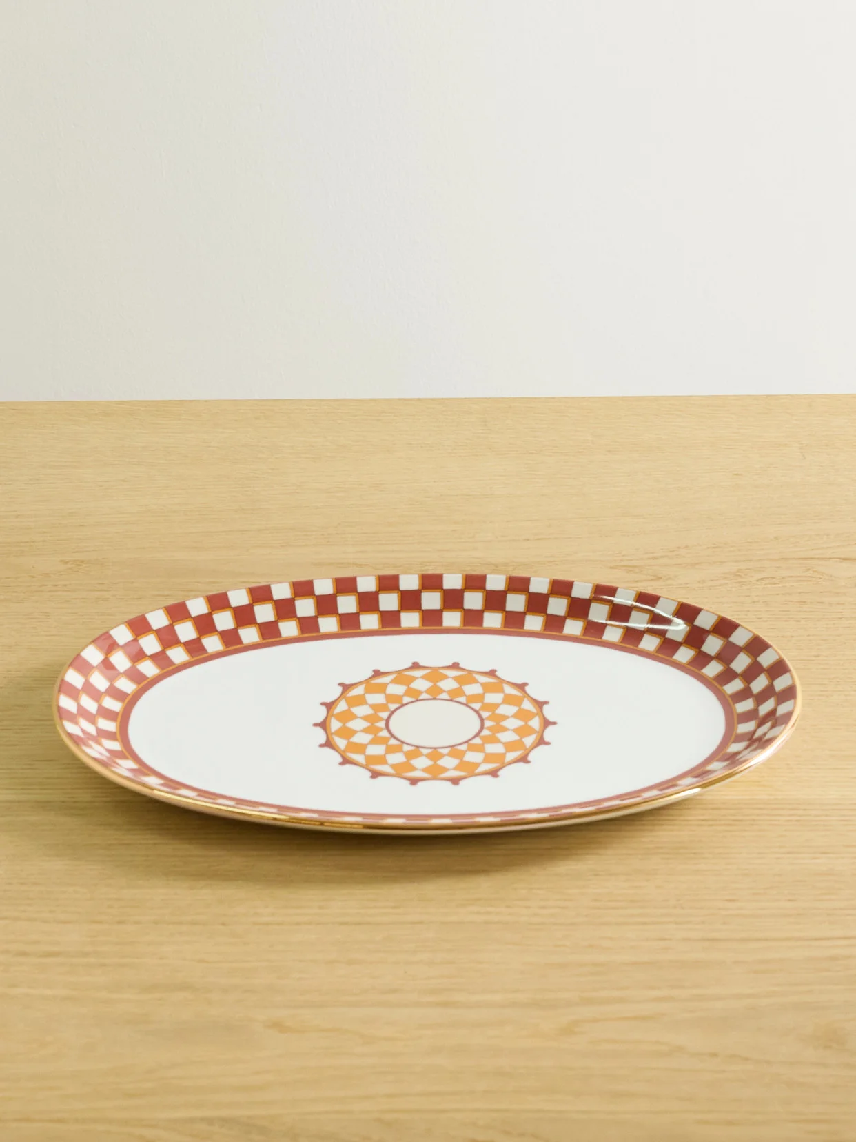 For La DoubleJ, the heart of every home is the table - that's why the label teams up with Italy's finest artisans to craft its exquisite designs. Sculpted from porcelain, this platter has a checkered rim plated with gold and is centered with a striking 'Apollo' pattern. Use yours to serve the main course or a showstopping dessert.