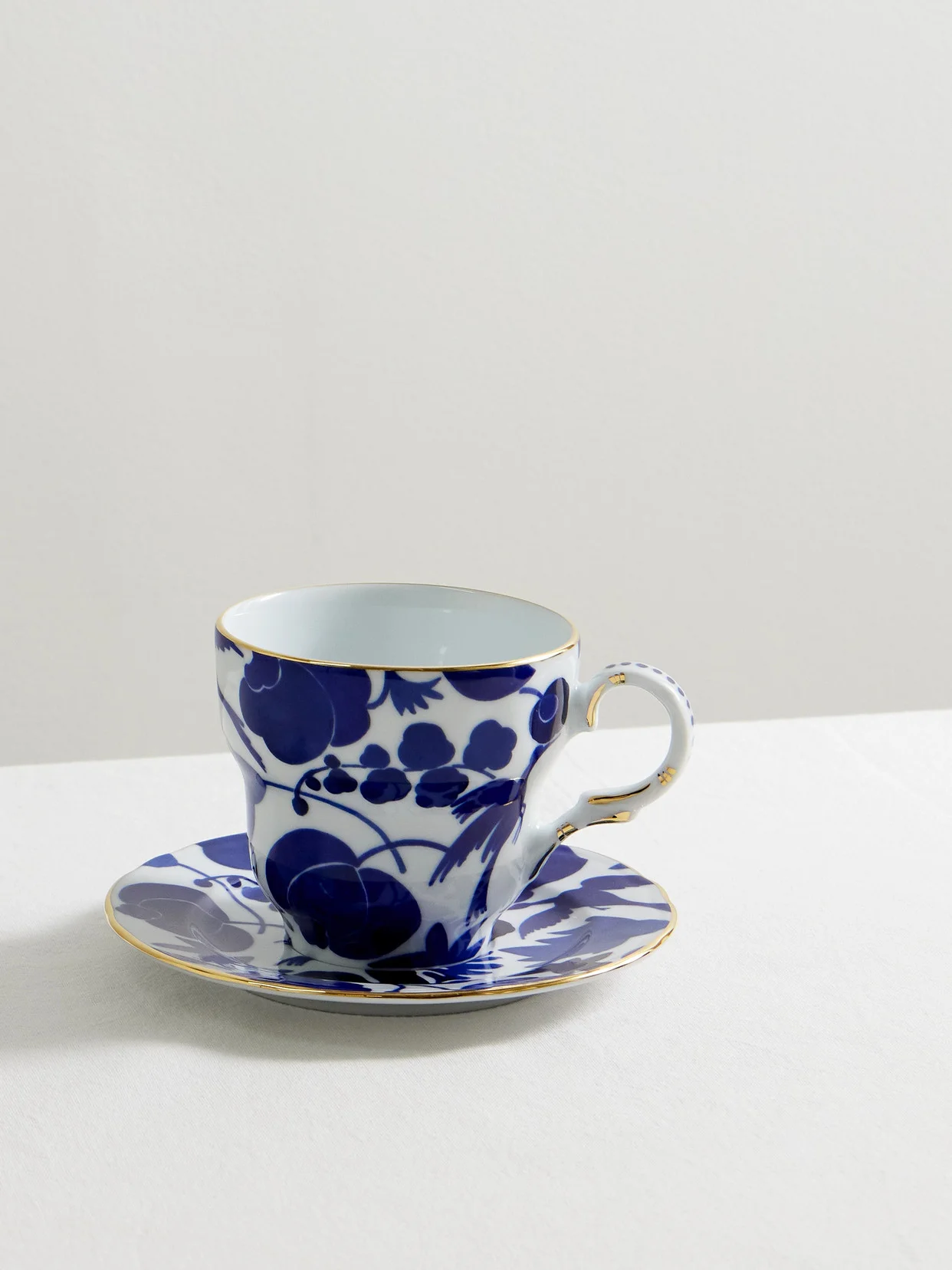 La DoubleJ's mug and saucer set embraces little moments of luxury, like the joy of tea for one. The duo has been expertly crafted in Italy from fine porcelain in the label's 'Wildbird Blue' design and is finessed with a shiny gold-plated rim.