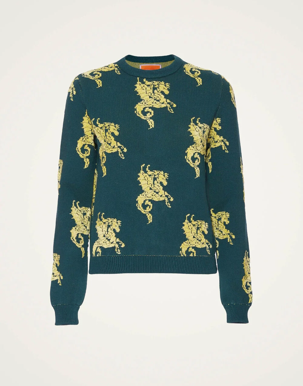 Channel the power of the gryphon - a legendary creature said to symbolise power, courage and prosperity - with the Gryphos Sweater. Crafted in an elegant jacquard and fleece blend, this classic round-necked, slim-fit sweater is as touchable as she is transcendent. Details & Fit - Round neck sweater - Slim cut - Raised print - 100% made in Italy - Composition:87%Viscose 8%Polyester 5%PBT