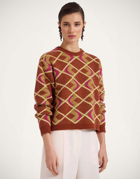 Who said wardrobe basics have to be basic? This classic crewneck is destined to become a backbone of your wardrobe with none of the bore in this happy-making Half-Light print. With a slim silhouette that hits long on the body, it’s crafted in our Italian jacquard which is light but still warm. Wear solo or layer it under one of our printed dresses for a cute pattern clash. Details & Fit - Crew neck sweater - Jacquard wool blend - Composition: 24% Wool 22% Nylon 20% Mohair 12% Polyamide 10% Viscose 8% Polyester 4% Cashmere - The model is 180 cm / 5′ 11″ tall and wears a size S