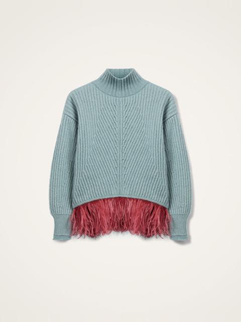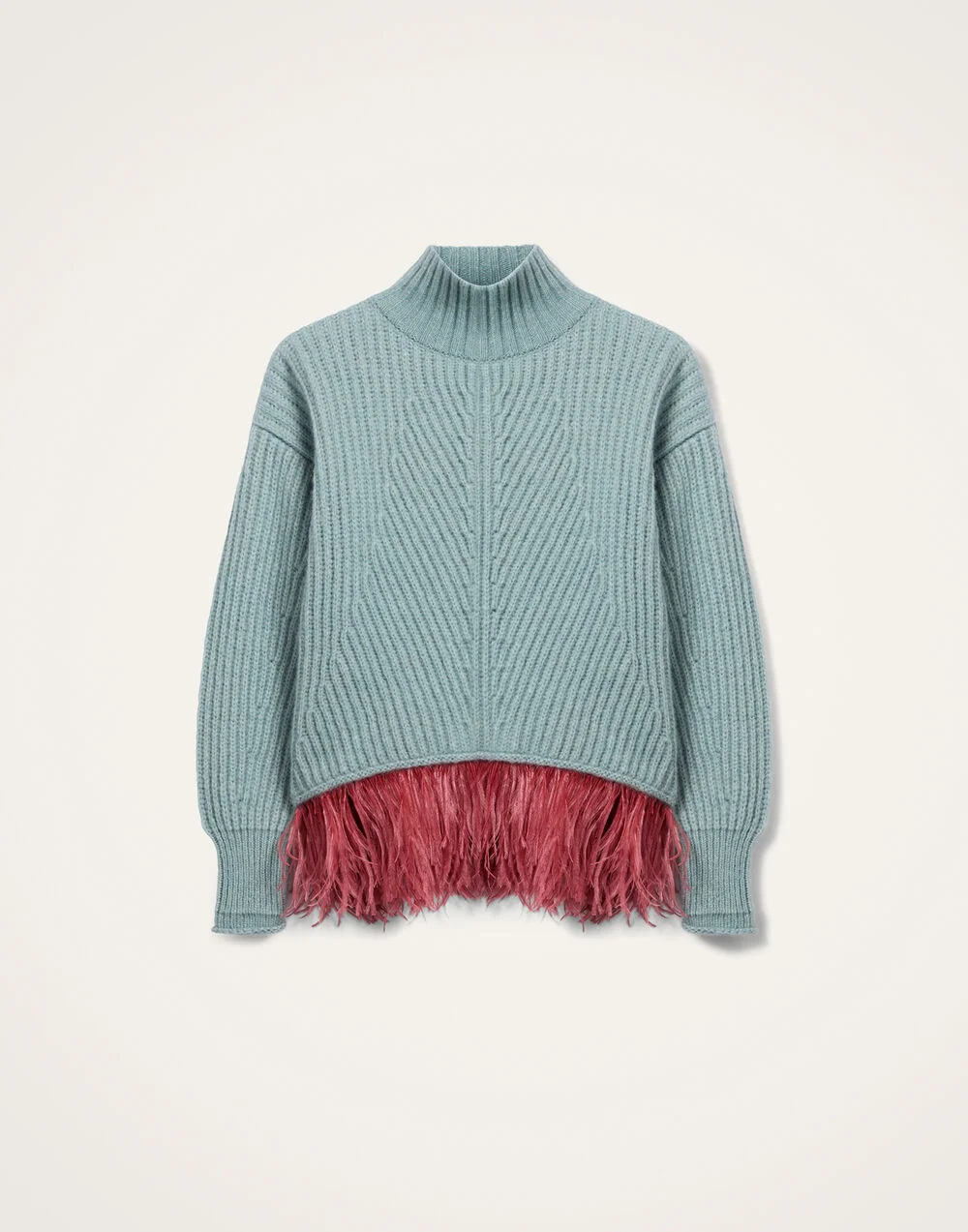 Isn’t it crazy when something you didn’t know existed just appears and now you can’t live without it? That’s how we felt when we first met our High Kick Sweater, the softest alpaca-blend beauty that had us instantly asking ourselves “why don’t all of my turtlenecks have feathers?” With its slightly cropped hem that flares just a touch into a plume of feathers, this is the most flattering way to “fancy” up your outfit (but not too much). Make your daytime look a little more maximal, or go full feathered glam with our Fancy Crop Jeans. Details & Fit - Slightly cropped fit, hitting at hip - Alpaca Wool blend - Long sleeve turtleneck - Feather trim at hem - Composition: 66%Baby Alpaca 22%Polyammide 10%Wool Merino Fine 2%Ostrich Feathers - Made in Italy
