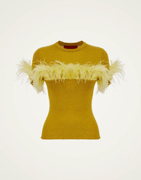 The High Kick Tee is the approval we all needed to wear feathers on the everyday. Bellissima with jeans, palazzos, skirts, sweatpants or whatever else you are loving right now, our ribbed T-shirt finished with feathers across the chest is officially the easiest way to elevate your wardrobe and send your mood soaring. Arrives in a luxurious cashmere-blend in an off-beat palette of hues for the full LDJ sensory experience. Details & Fit - Cashmere silk knit - Short sleeves - Ostrich feather trim across chest and sleeves - Ribbed - Crew neck - 100% Made in Italy - Composition: 68% Cashmere 30% Silk 2% Ostrich Feathers - The model is 179 cm tall and wears a size S - Garment length: 55cm