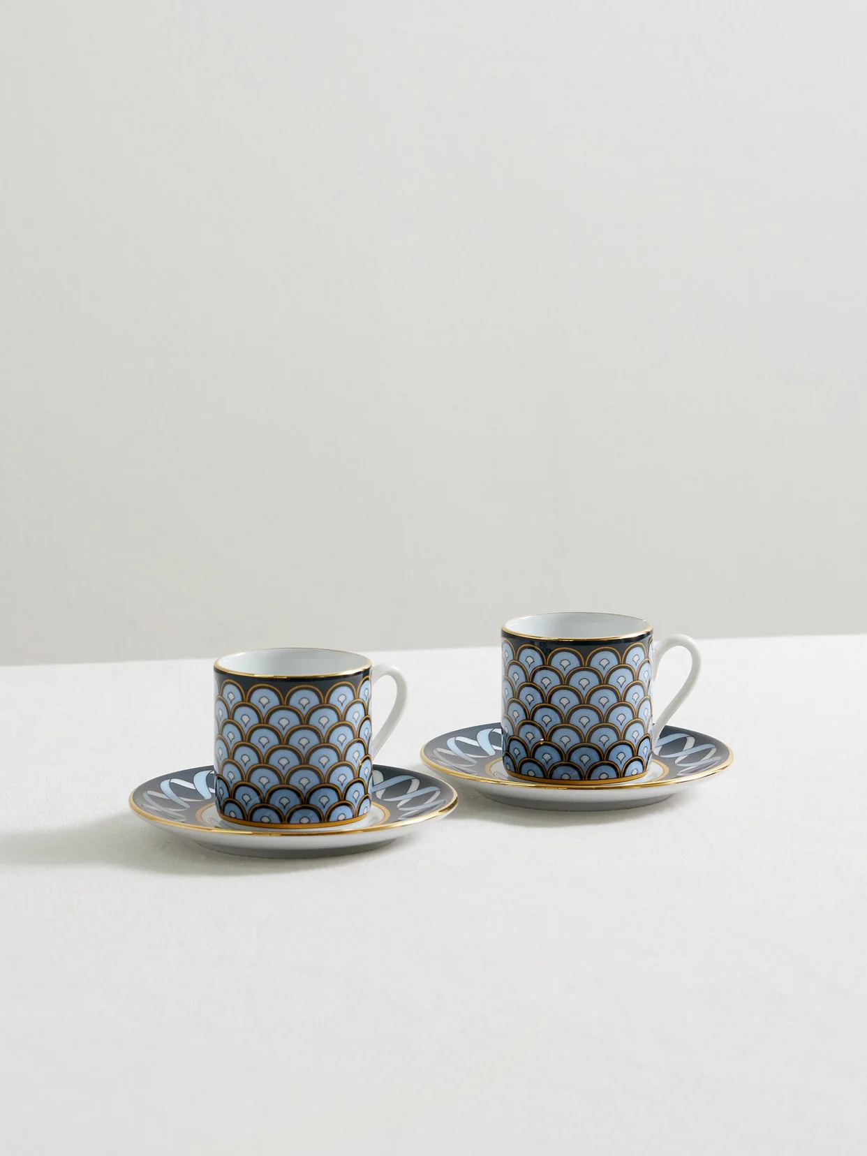 La DoubleJ's 'Impero' set of two porcelain espresso cups and saucers comes in the label's 'Odysseus' design. Each piece has been brought to life in Italy by a talented team of experts, with a glinting 18-karat gold-plated outline.