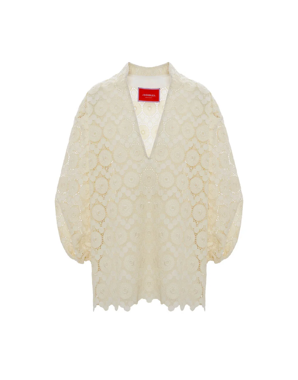 Oversized but elegant, intricate but effortless, the Jackie Top is everything you want in a sophisticated summer shirt. With a high-low hem and roomy back, she’s a throw on a glow kind of top, crafted either in our powerful printed lace, light cotton poplin or elevated evil eye macrame. A little sheer, she can still be worn braless without leaving you super exposed, and is long enough to cover your bathing suit and chic enough for a night out in Portofino. Details & Fit - Evil Eye Macrame - Long sleeved top - Slightly Oversized - Slightly sheer - Hits below bum - V neck - Voluminous sleeves with elasticated cuff - Made in Italy - Composition:92%Cotton 8%Polyester - The model is 177 cm tall and wears a size S - Garment length: 68cm