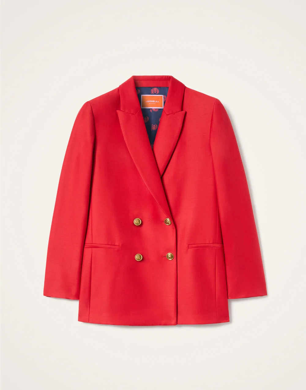 The queen of Studio54 cool, Bianca Jagger was our muse for this sleek new number. Tailored to perfection, this double-breasted beauty is a little bit masculine with a strong shoulder, but still feminine in a long flattering fit. Cut in our super special virgin wool satin, this iteration is the ultimate elevator in punchy poppy red, ready to turn jeans, pants or skirts into outfits of supreme beauty. Details & Fit - Garment fit: oversized - Rustic Cotton - Double breasted blazer - Scarab buttons - Pockets - Hits below bum - 98% Cotton 2% Elastane - Fully lined - Made in Italy - The model is 178 cm / 5′ 10″ tall and wears a size S