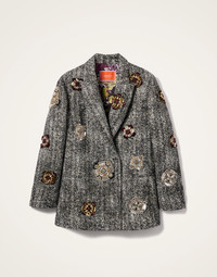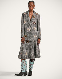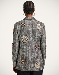 The queen of Studio54 cool, Bianca Jagger was our muse for this sleek new number. Tailored to perfection, this double-breasted beauty is a little bit masculine with a strong shoulder, but still feminine in a long flattering fit. Arriving in our embroidered Nucleus print inspired by the abundance of mother earth's bounty, this beauty goes with jeans and dresses alike. Details & Fit - Embroidery - Double breasted blazer - Pockets - Hits below bum - 100% Made in Italy - The model is 178 cm / 5′ 10″ tall and wears a size S