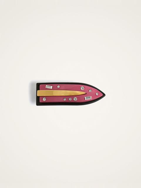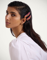 We're getting nostalgic for the Nineties around here, and so have crafted some high-vibration vintage-inspired hair clips to add a youthful pop of color to our everyday wardrobe. But don't mistake these for your basic teenage accessories, amore. These come crafted from super chic colored resin with brass studs for a little more edge. Details & Fit - Resin hair clip with brass studs - Composition: 40% Polyester 35% Acrylic 16% Brass 5% Steel 4% Glass - Made in Italy